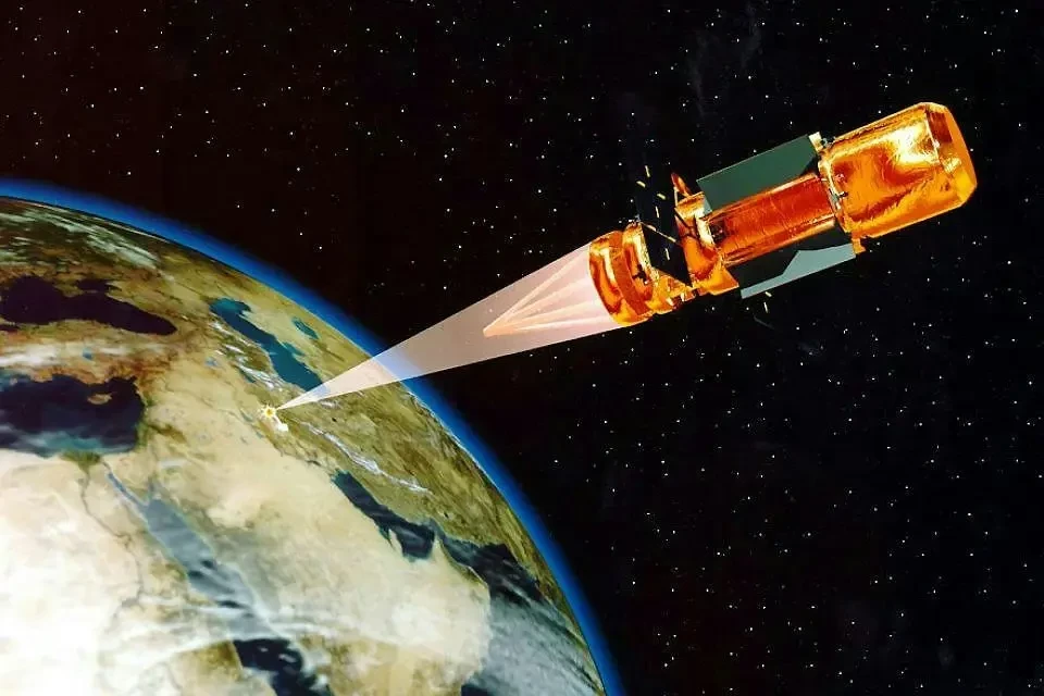 Художественное представление космической системы противоракетной обороны на основе пучковых частиц из эпохи «Звёздных войн». Лос-Аламосская национальная лаборатория, обзор аэрокосмических проектов