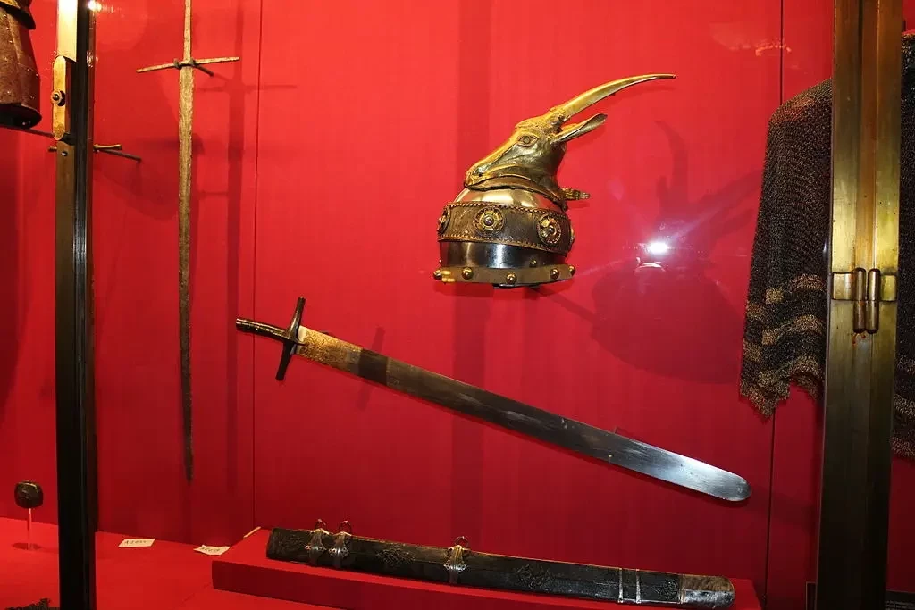 Шлем и меч Скандербега, музей искусств, Вена. Обратите внимание, что шлем украшает голова горной козы, молоком которой он питался, будучи блокирован на вершине бесплодной горы