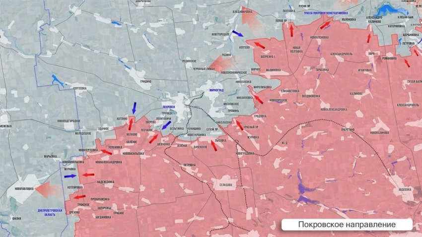 На Покровском направлении положение ВСУ крайне напряжённое: ВС РФ не снижают накала атак в Муравке, бои южнее Удачного. В районе Котлино наши войска синхронно атакуют вдоль железной дороги на запад и на восток. В районе Фёдоровки наши равномерно распределяют резервы по всему северо-восточному флангу, наращивая давление, чтобы прорваться к Суворову. Однако Новоегоровка, об освобождении которой, как пишут, заявили в телеэфире, по-прежнему контролируется ВСУ. На восточном охвате Покровска ВС РФ приближаются с севера к Новоэкономическому, расширяют зону контроля в районе Попов Яра, сообщает Олег Царёв в своём Telegram-канале.
