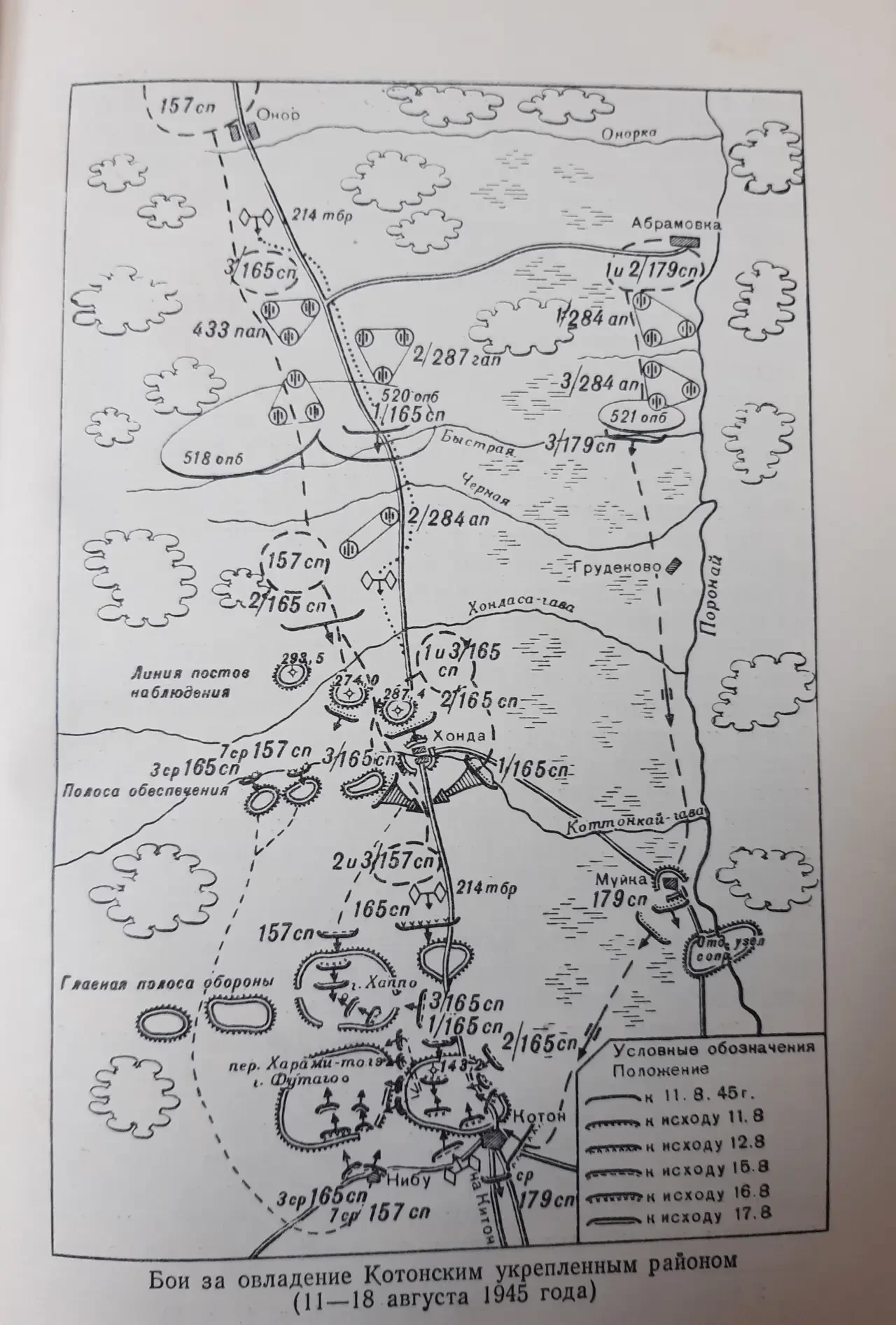 Можно недоумевать, почему это 179-й полк 79-й стрелковой дивизии был брошен через болота поймы реки Поронай наступать на поселок Муйка (сейчас не существует). Однако, во-первых, от границы к этому поселку шла грунтовая дорога, а от поселка к югу были еще грунтовые дороги, ведущие на юг, в том числе к Кетону, находившемуся в 11 км южнее Котона. Во-вторых, к югу от Муйка пролегала уже упомянутая узкоколейная железная дорога с мостом через Поронай. Эта узкоколейка была настоящей «ахиллесовой пятой» японской позиции, по ней, как по проспекту, можно было пройти до самого Котона.