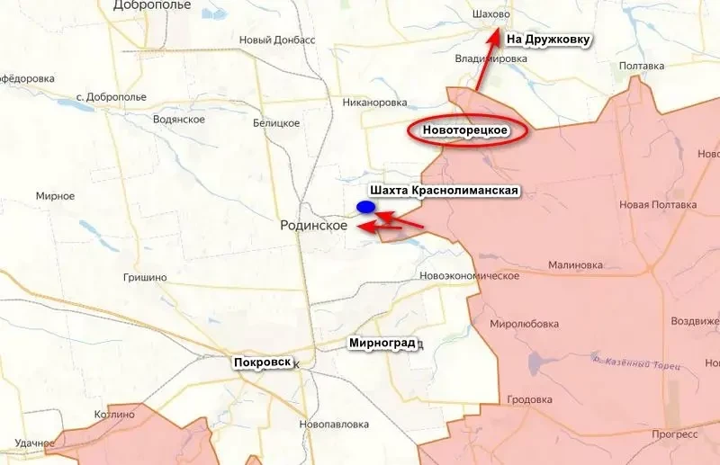 Стоит отметить, что Новоторецкое — это уже не охват Покровско-Мирноградской агломерации, а начало наступления в сторону Дружковки мимо Константиновки. А там далее выход к Краматорску и Славянску — последней линии обороны противника на Донбассе. Впрочем, это в перспективе, сейчас стоит задача завершить окружение Мирнограда с Покровском, перерезав все линии снабжения.