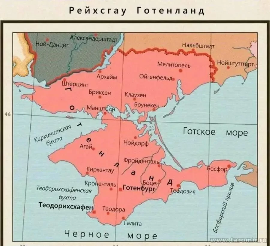 В новое марионеточное государство Готланд, конкретно в Севастополь – Теодорихсхафен, в Симферополь – Готенберг и в другие крымские города должны были переселиться обделённые немцы из Чехии и Южного Тироля в Северной Италии и Швейцарии. Свой соответствующий приказ по Крыму фюрер отдал ещё в апреле 1941 года, когда план «Барбаросса» только верстался.
