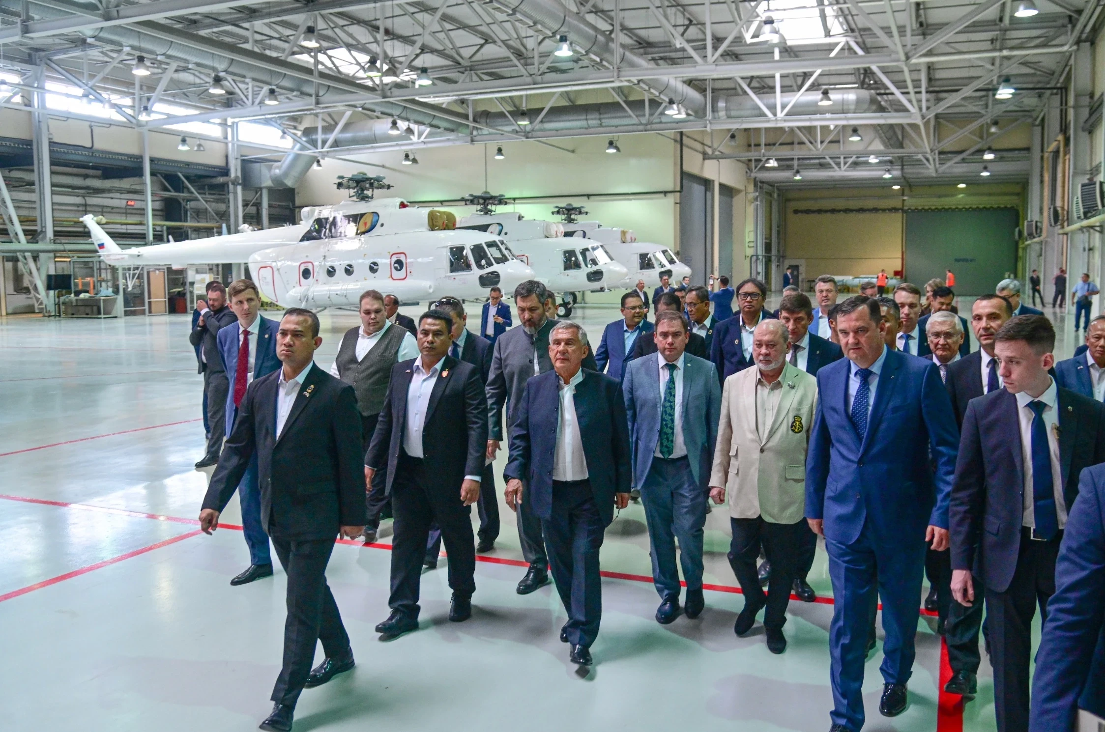 Гостю представили линейку вертолетов казанского предприятия: Ми-38 с салоном повышенной комфортности, Ми-8МТВ-1 в транспортном варианте и в премиум-модификации, а также легкие Ансаты в полицейском и санитарном исполнениях. Кроме того, в новом летно-испытательном корпусе была организована выставка промышленного потенциала Республики Татарстан, где делегация Малайзии во главе с монархом ознакомилась с техникой крупнейших предприятий региона.