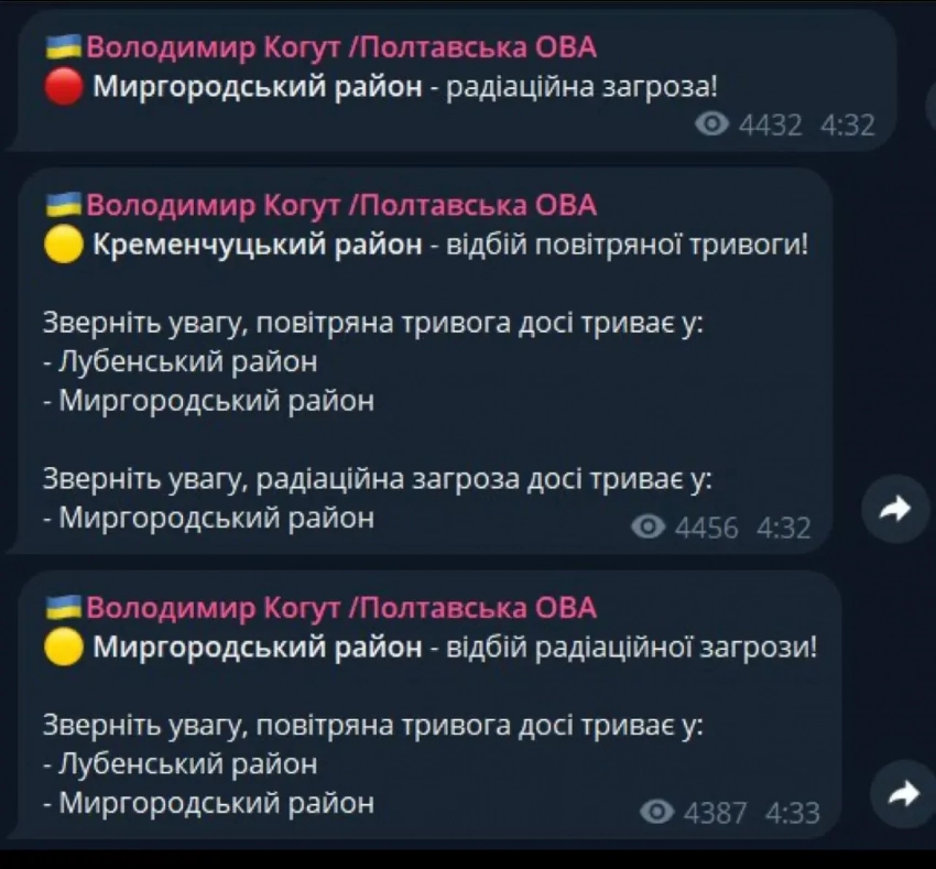 По словам Когута, в Миргородском районе Полтавщины объявлена радиационная опасность.