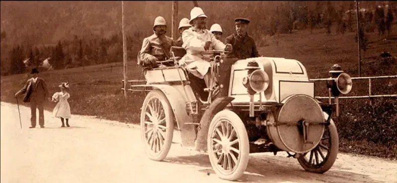 Вот он, легендарный Daimler Phönix, впоследствии ставший «Мерседесом». На фотографии версия 1897 года, за рулём Эмиль Елинек (Emil Jellinek), давший ему это имя.