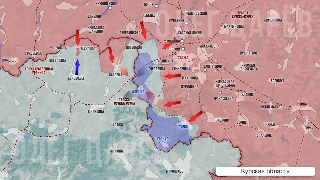 В курском приграничье и на Сумском направлении бои приобретают позиционный характер, продвижение Вооружённых сил Российской Федерации (ВС РФ) на рубеже Журавка - Басовка-Гоголевка-Горналь практически замерло. Противник усилил оборону, перебросил сюда части с других направлений и изо всех сил пытается не допустить прорыва наших войск вглубь украинской территории.