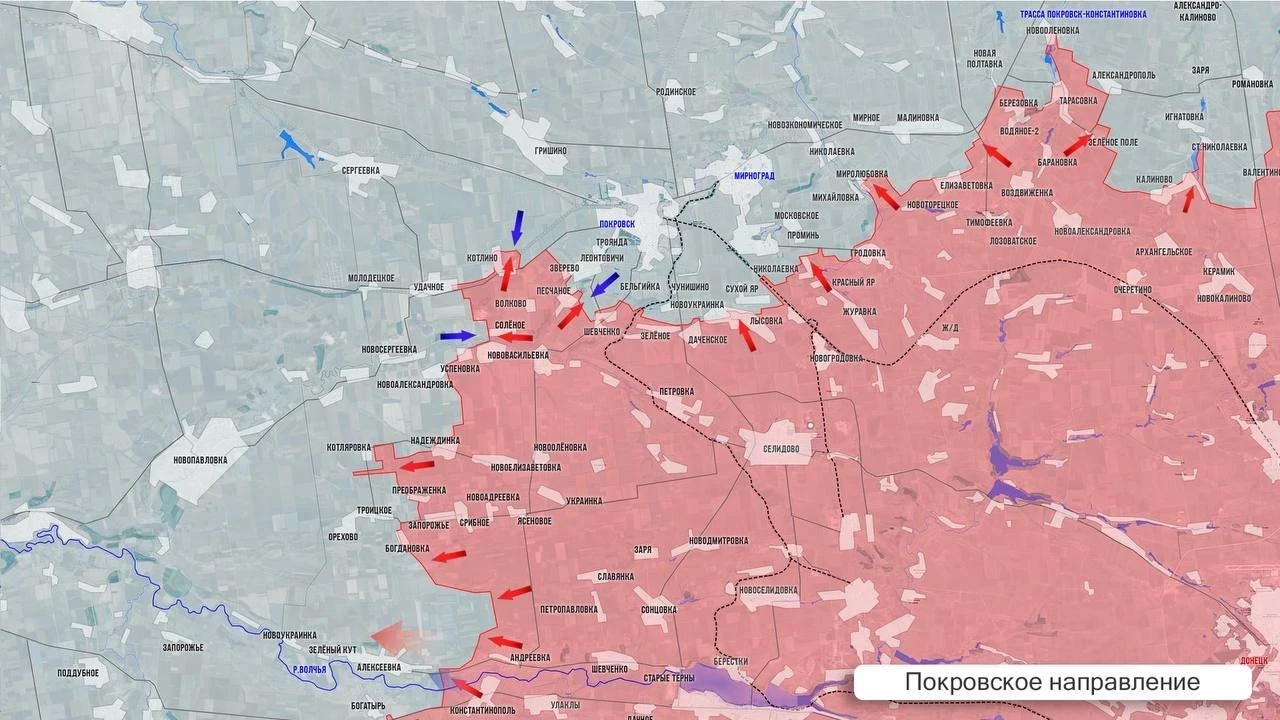 На Покровском фронте ВС РФ рвутся к границе Днепропетровской обл. Есть продвижение в Орехово, где противника постепенно выдавливают с центральной улицы. МО РФ сообщило об освобождении Котляровки. ВС РФ продвинулись по лесопосадкам западнее Новоалександровки и фактически вышли на окраины Новониколаевки – еще одного приграничного села. В Удачном и Котлино ВСУ контратакуют, наши держат позиции. В Зверево и в районе южных окраин Леонтовичей тяжёлые бои за контроль над двумя терриконами, которые пока под контролем ВСУ. Со стороны Нового Труда наши войска стараются продвинуться в сторону Новоукраинки и Бельгийки.
