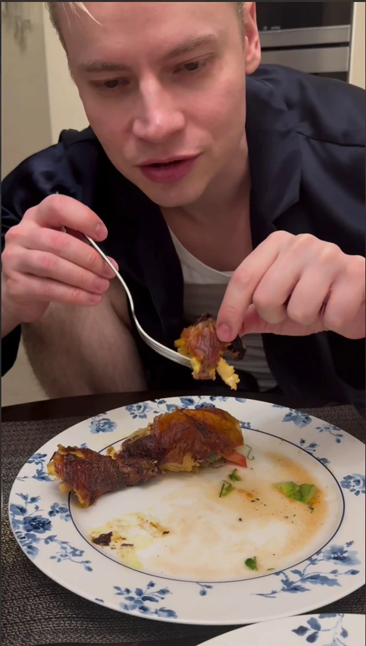 Обстановка за ужином была достаточно интимная. Ярослав сидел за столом в распахнутом пиджаке, шортах и майке. Певец комфортно устроился на стуле, поджав голую ногу, и с аппетитом уплетал курочку.