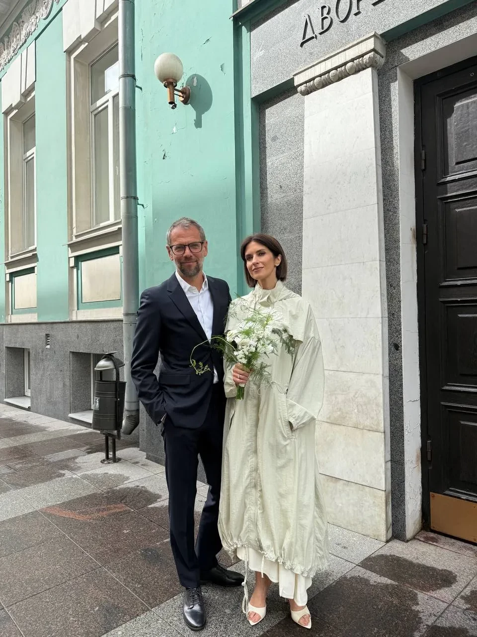 Торжество состоялось в Грибоедовском ЗАГСе в Москве. Для церемонии Ксения выбрала платье Prada и плащ Sanchy в тон, дополнив образ минималистичным букетом невесты. Жених был в классическом чёрном костюме. Праздник прошёл в кругу близких — с парой были их дети от предыдущих отношений.