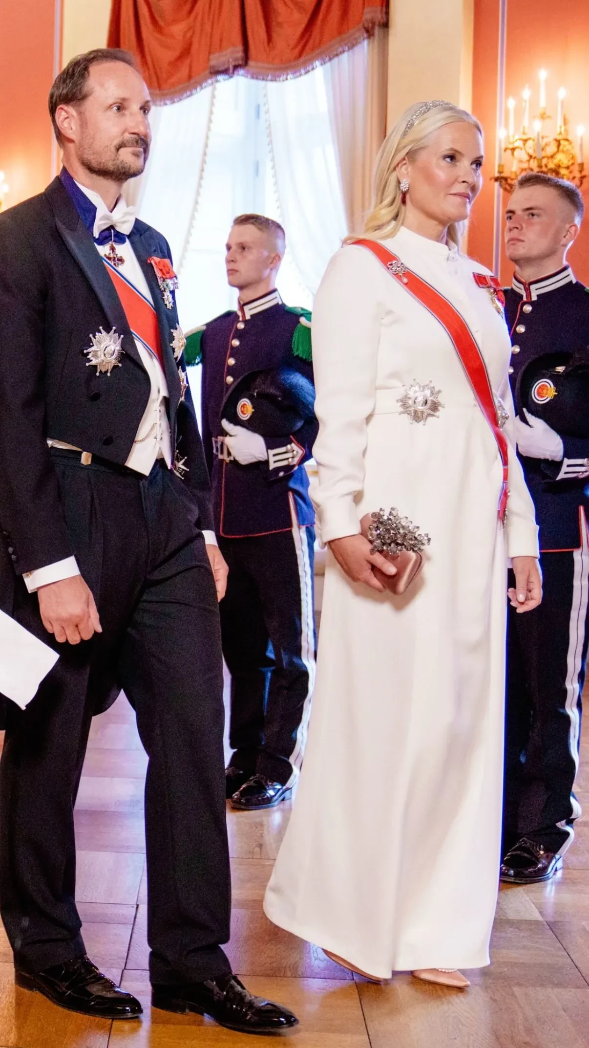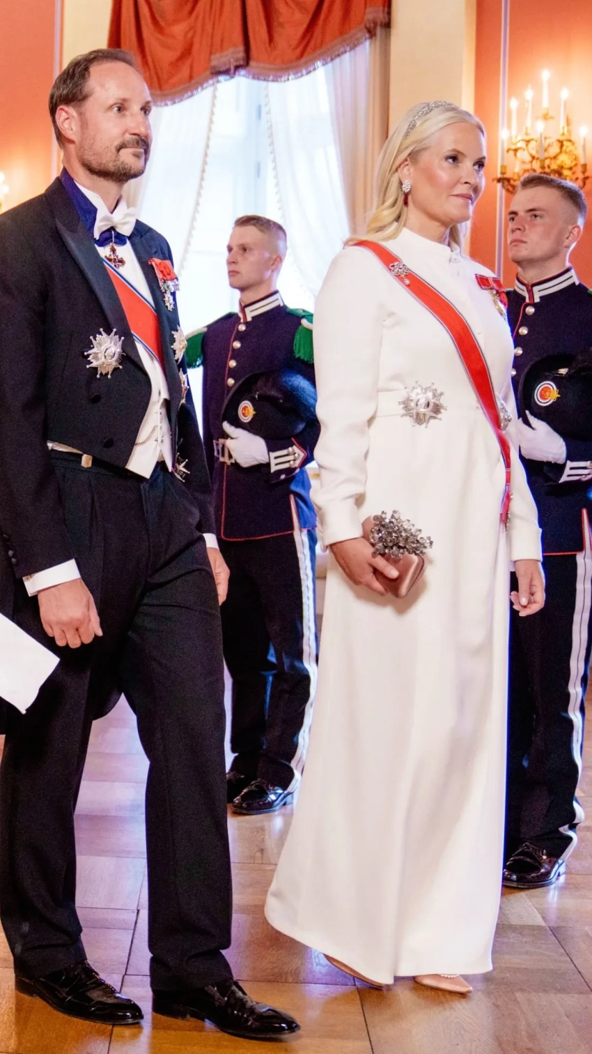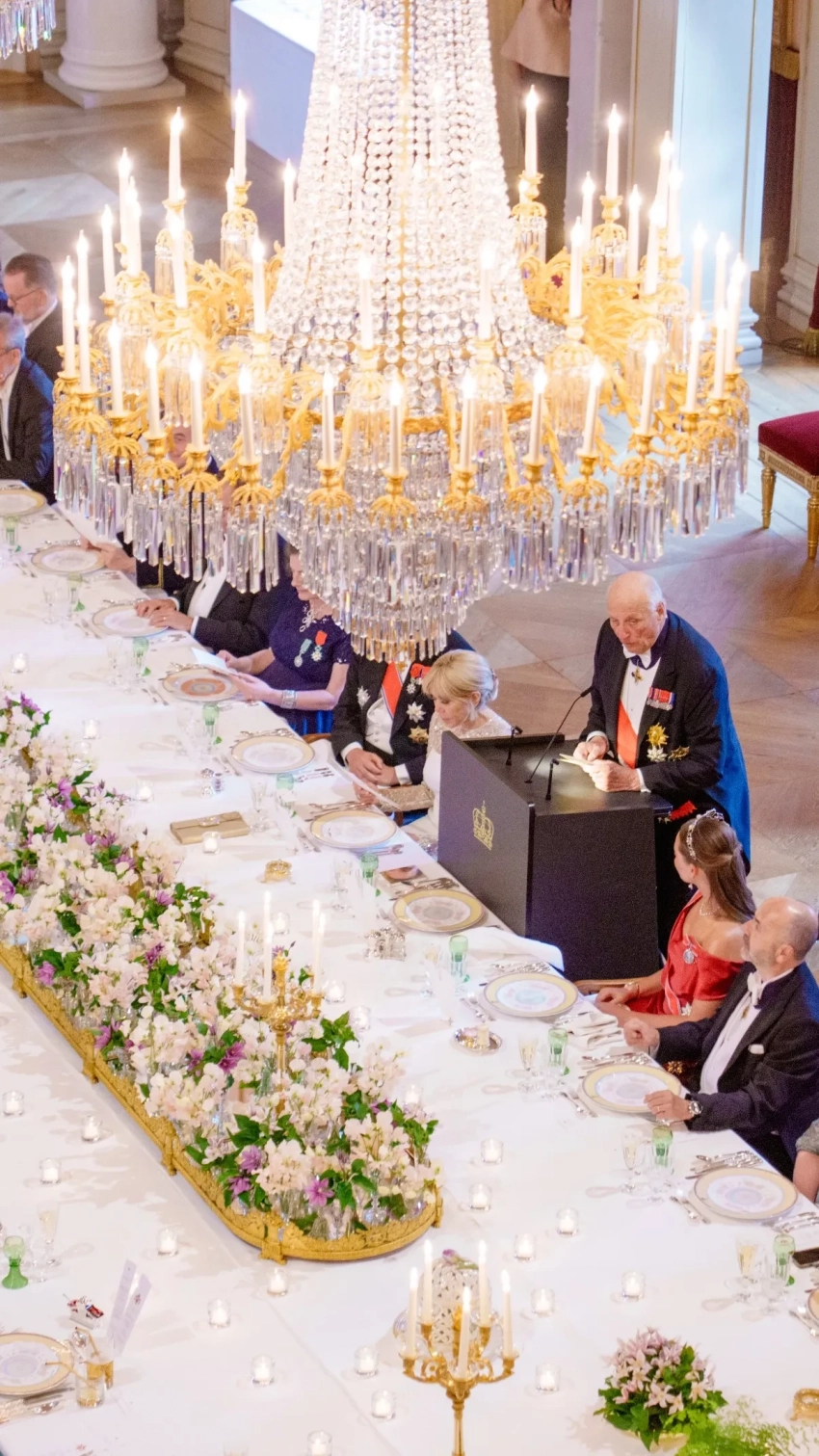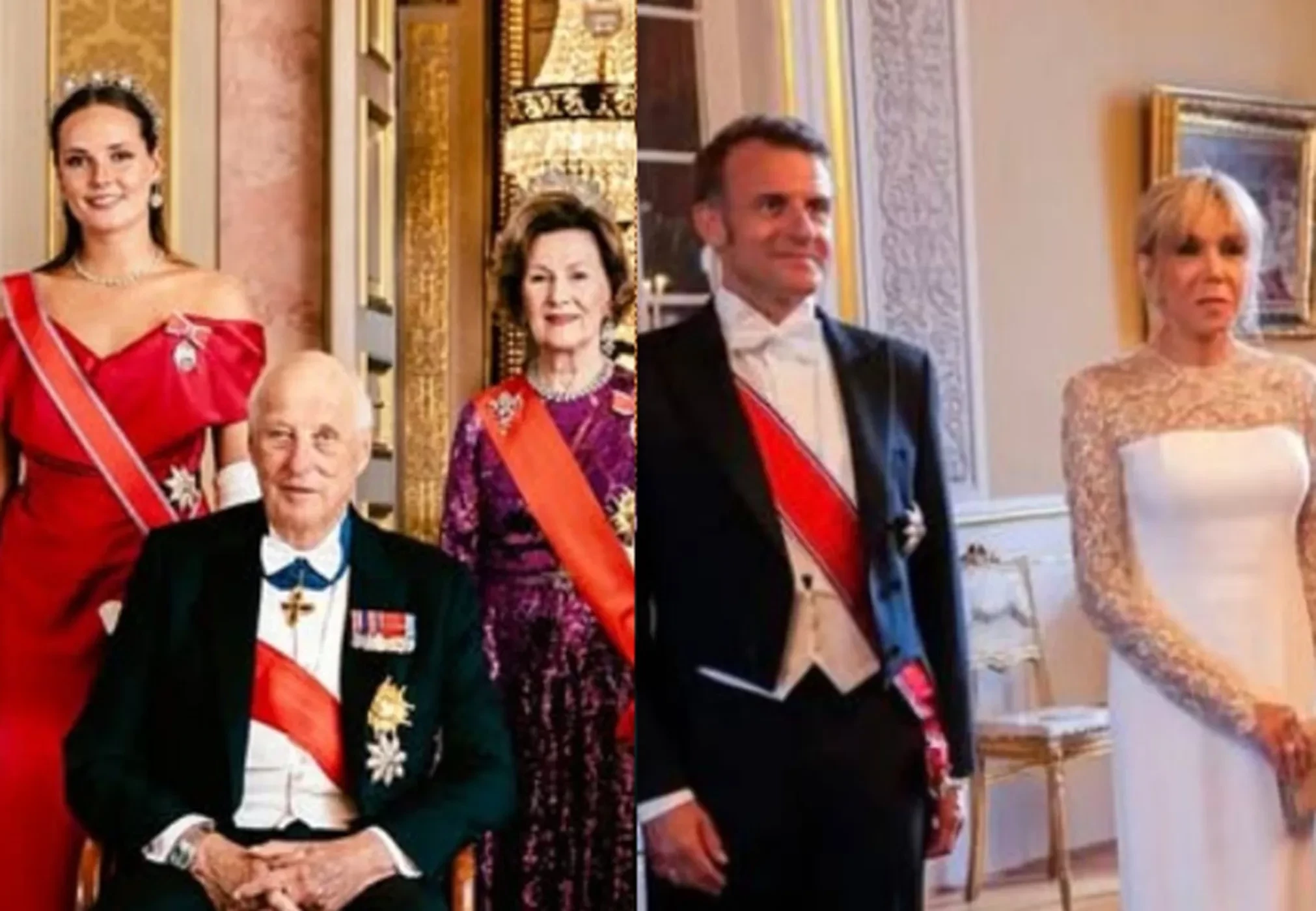 Отмечается, что президент Франции впервые прибыл в Норвегию за более чем 40 лет. По случаю официального визита двор устроил гала-ужин в Королевском дворце в Осло с участием короля Харольда и королевы Сони, а также кронпринцессы Метте-Марит, принцесс Ингрид Александры и Астрид (первая была в платье от Vivienne Westwood).