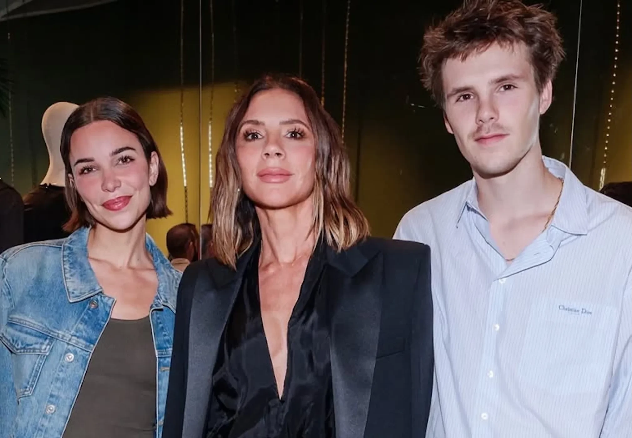 Джеки Апостел, Виктория Бекхэм и Круз БекхэмВиктория надела на вечеринку образ из новой коллекции своего бренда Victoria Beckham с прозрачной юбкой и жакетом. 20-летний Круз, который решил начать музыкальную карьеру, позировал рядом со звёздной матерью в джинсах и голубой рубашке Christian Dior, а его 29-летняя возлюбленная пришла в джинсах на низкой посадке и куртке в тон.