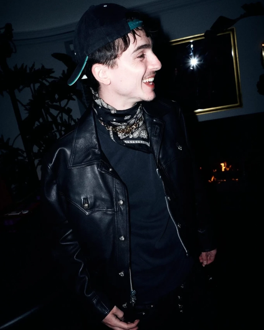 Кайли надела прозрачное чёрное кружевное платье, а Тимоти выбрал чёрную футболку, кожаный жилет и бандану. На совместном снимке пара обнималась и выглядела счастливой.