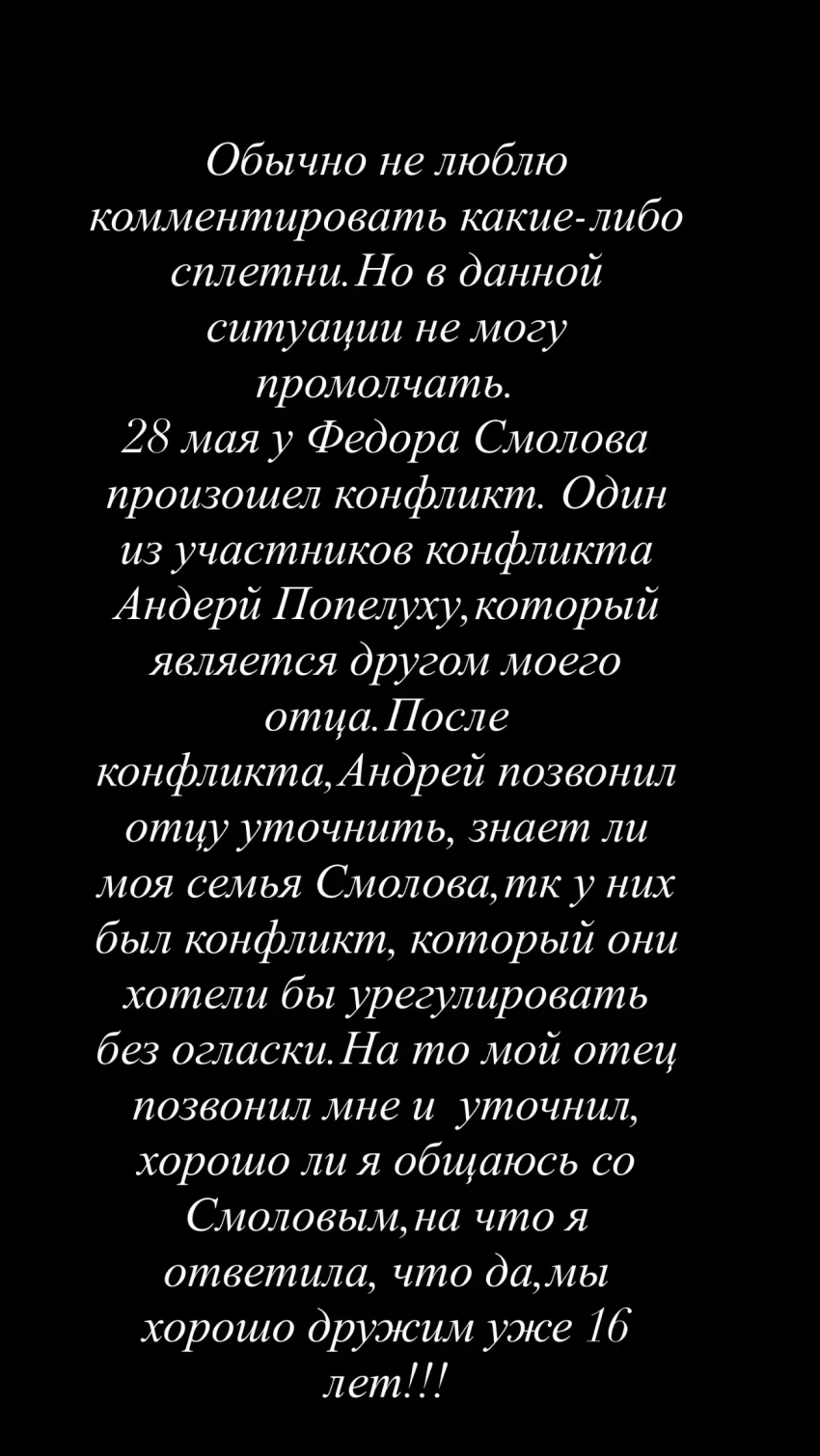 Сторис Дарьи ВалитовойВалитова подчеркнула, что после этой встречи её отец больше не контактировал со Смоловым. "Мне больно и неприятно, что после стольких лет дружбы и искренних побуждений помочь своему другу всё вот так происходит", — написала она. Дарья также добавила, что пыталась повторно связаться с Фёдором, но тот не ответил на звонок, а позже прислал сообщение: "Это не я, это мои адвокаты". По её мнению, за реакцией спортсмена стоит влияние его юристов и PR-команды. "Понимаю, что его адвокаты, пиарщики и прочие люди, которые ему помогают, не могут обойтись без фамилии Кокорин. Но всё же это некрасиво! Я думаю, что его реакция на мой звонок тому доказательство", — резюмировала она.