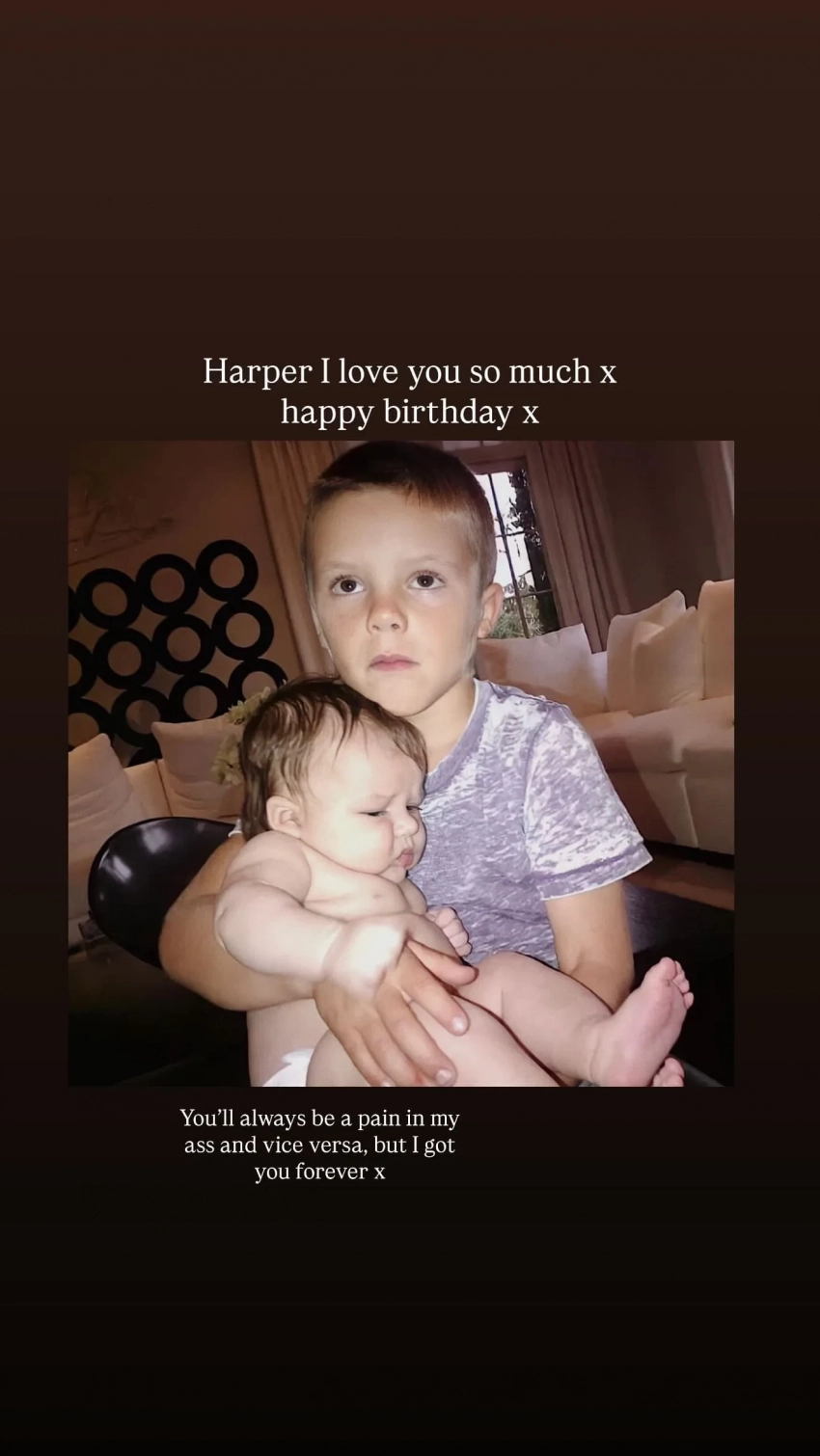 Круз и Харпер БекхэмРанее стало известно, что Бруклин Бекхэм пропустит день рождения младшей сестры из-за конфликта с родителями. Источники также сообщили, что Харпер всегда была близка с братом, поэтому его отсутствие станет для неё "настоящим ударом".