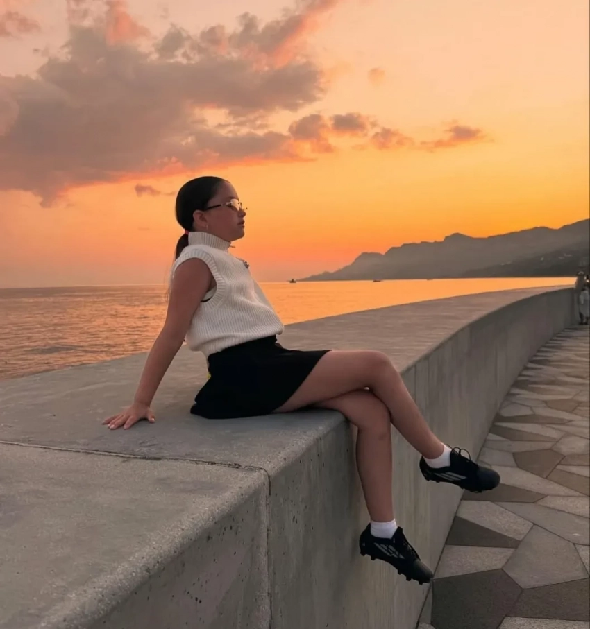 Актриса уточнила, что снимки сделала 9-летняя Мия. “Миюшка сфоткала”, — написала она. На кадрах Муцениеце сидит на пляже на фоне заката в коричневом платье в горошек. Один из снимков запечатлел её с рукой на округлившемся животе: актриса ждёт ребёнка от своего жениха Петра Дранги (хотя в сети ходят слухи, что его настоящим отцом является миллиардер Сулейман Керимов).