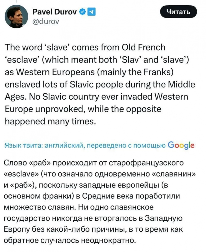 Пост Павла ДуроваВ своём аккаунте в соцсети X Павел Дуров объяснил этимологию слов: "Слово "раб" происходит от старофранцузского esclave (что означало одновременно "славянин" и "раб"), поскольку западные европейцы (в основном франки) в Средние века порабощали множество славян". Кроме того, он добавил историческую справку: "Ни одна славянская страна никогда не вторгалась в Западную Европу без провокации, в то время как обратное происходило неоднократно".