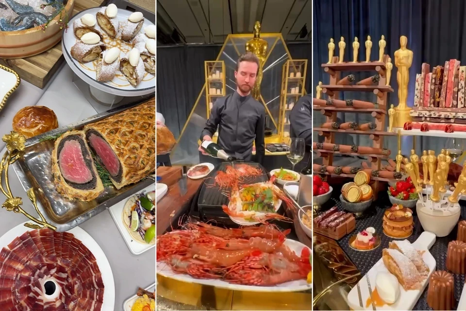 Чем кормили? На этот раз съедобные статуэтки "Оскар" были не только шоколадные, но и из копченого лосося с черной икрой белуги. Салаты и закуски: салат из свеклы, козьего сыра, щавеля; салат с фалафелем, нутом, веганским сыром, свеклой, лимоном; креветки в кляре с рисом; тартар из тунца в кунжутных мисо-конусах; тарт (открытый пирог) с хумусом; чебуреки - с авокадо, цветной капустой, орешками; драники из батата и кабачка; ассорти из пицц; пироги с курицей и трюфелем; паста с сыром, пюре, трюфельным соусом. Горячее: венгерский гуляш; треска с гарниром; стейки; чизбургер. И многое другое. Более тридцати видов десертов: пирожные; мармелад; мороженое; дубайский шоколад; штрудель и другие сладости.