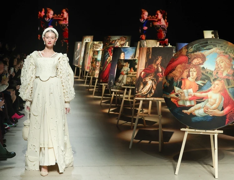 Команда молодых дизайнеров из Sergey Sysoev fashion school превратила подиум в картинную галерею. Модели в пышных платьях с кринолинами неспешно передвигались вдоль холстов с произведениями великих художников, в том числе Леонардо да Винчи и Микеланджело.