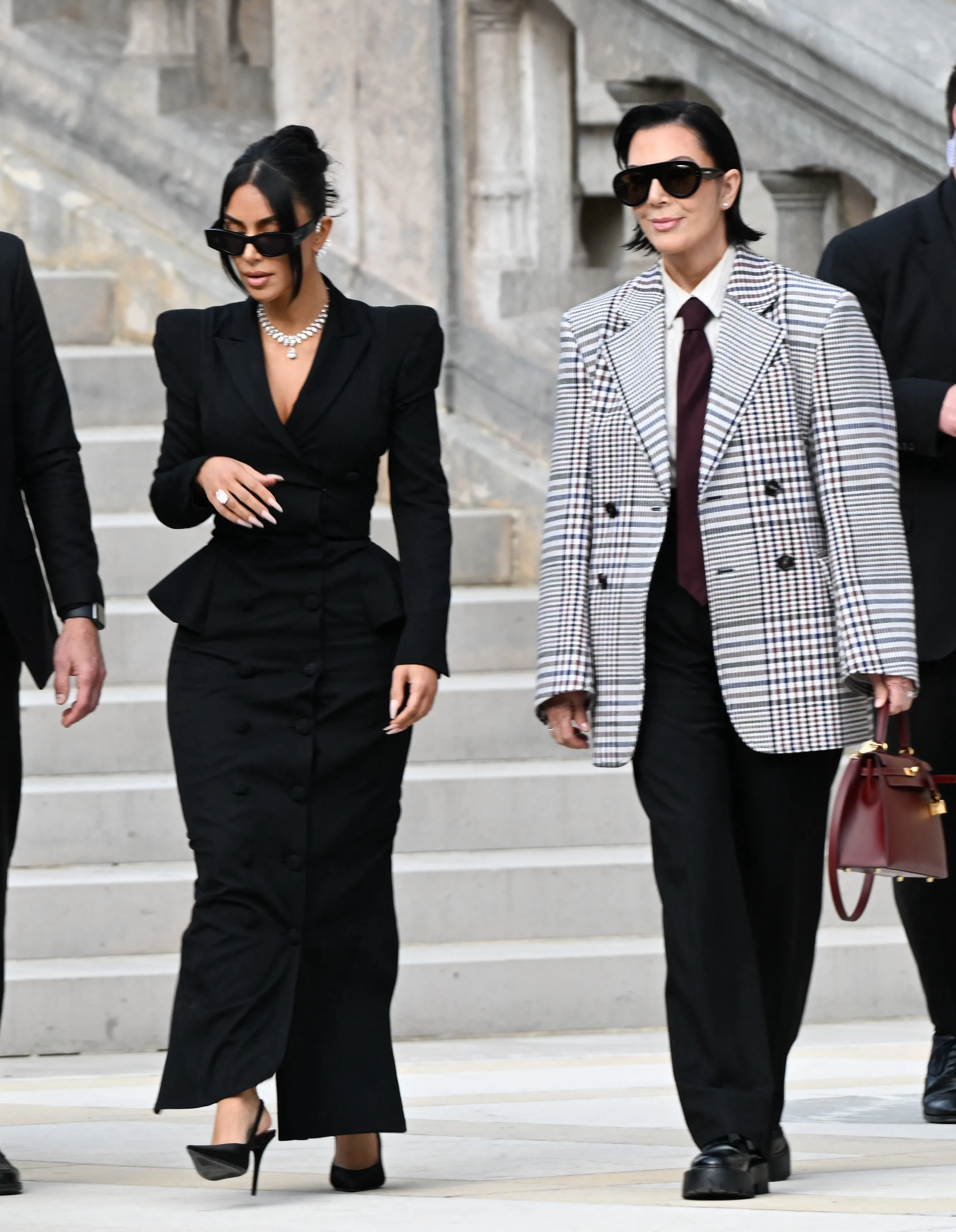 Ким Кардашьян и Крис ДженнерКим КардашьянСвой образ Ким также дополнила каффом с бриллиантами Briony Raymond за восемь тысяч долларов, парой бриллиантовых серёг и кольцом с массивным камнем, её лодыжку украсил браслет с именами детей, который Кардашьян на День матери подарила её старшая дочь Норт. Компанию Ким в суде составила её 69-летняя мать Крис Дженнер.